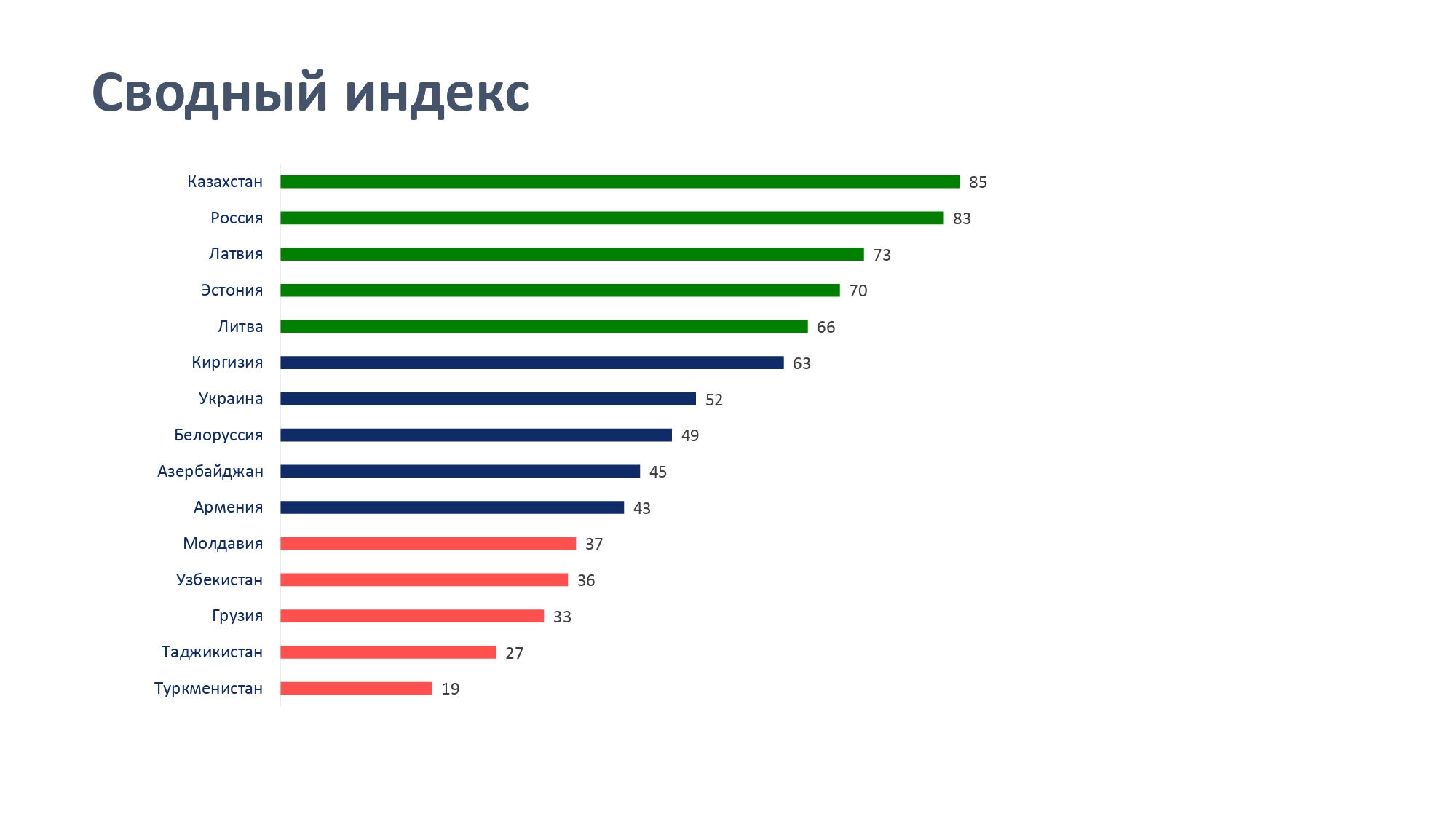 Сводный индекс возглавил Казахстан — 85, незначительно опередивший Россию — 83. За ними идут Латвия и Эстония — 73 и 70 соответственно.